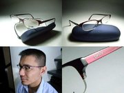 這款DKNY眼鏡, 義大利製, 鏡框暗紅色帶著絲絲琉璃光澤, 鏡腳暗紫色(照片中因為打光的緣故比較亮). 非常迷人好看