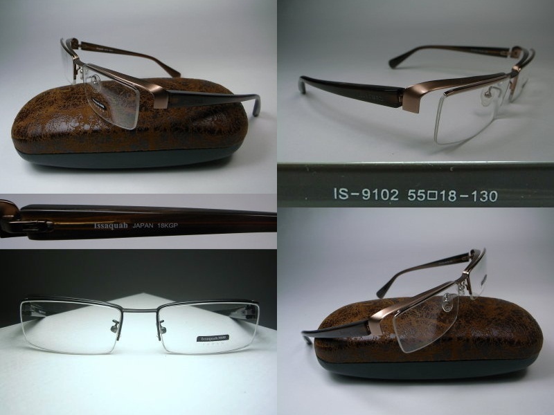 全新真品 Issaquah 光學眼鏡, 日本製, 時尚設計鏤空立體款式, 18K金電鍍 咖啡色金屬下無框, 鏡架上有 Issaquah 的 logo.