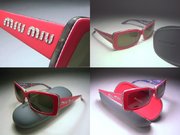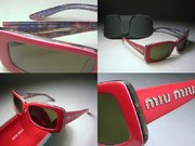 全新真品 miu miu 太陽眼鏡, 公司貨, 紅色水鑽款式膠框, 鏡架兩側皆有 miu miu 字樣及水鑽襯飾.