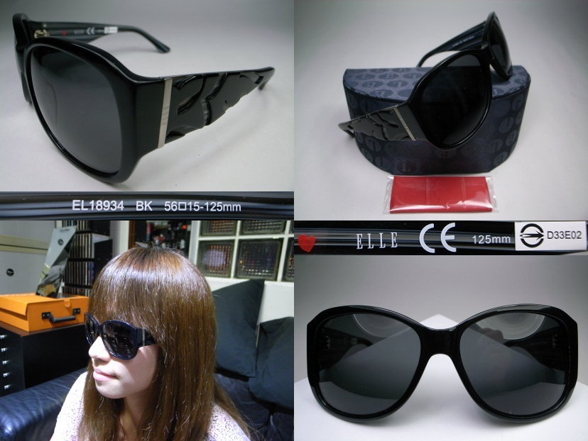 全新真品 ELLE 太陽眼鏡, 法國品牌 黑色膠框橢圓框, 頂級板料材質, 鏡架兩側都有ELLE字樣的金屬飾片