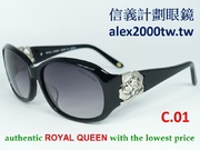 全新真品 ROYAL QUEEN 太陽眼鏡, RQ105 日本製 大膠框, 東方版山茶花款, 超越香奈兒, 鏡架轉軸處有山茶花設計, 內有水鑽相襯.