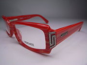 全新真品 VERSACE 凡賽斯光學眼鏡, 義大利製, 小雅公司貨, 紅色水鑽膠框方框, 兩邊鏡架上都有Versace字樣.