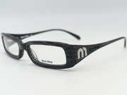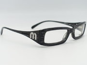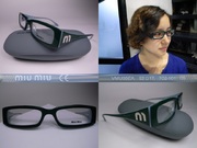 全新真品 miu miu 光學眼鏡, 小雅公司貨, 墨綠色彈簧膠框, 鏡架兩側皆有鏤空 miu miu 字樣和 M型金屬 LOGO.
