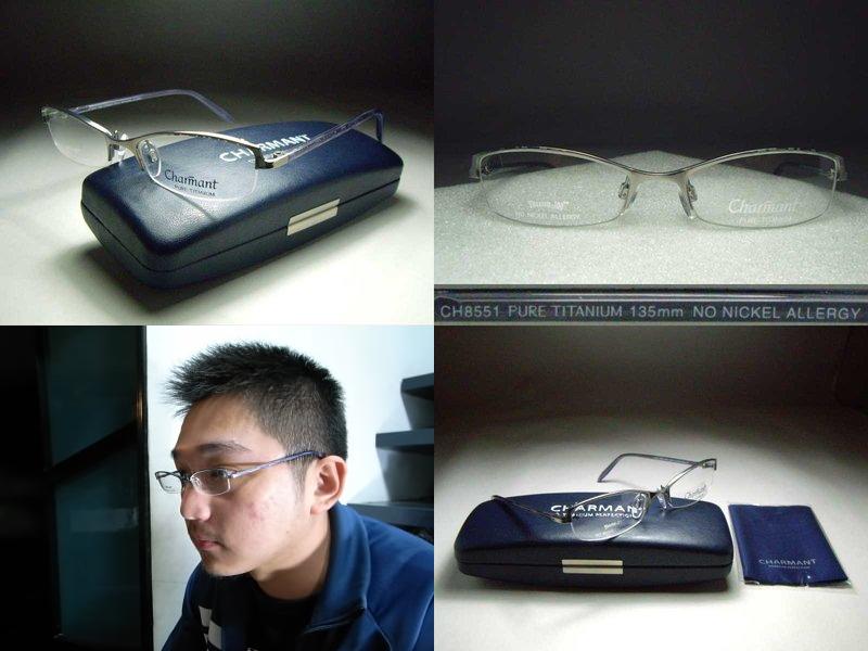 全新真品 Charmant 光學眼鏡, 日本製銀色純鈦金屬下無框, 不過敏材質, 鏡框上緣有電琺瑯般格狀圖案, 台灣總代理羅氏公司貨, 眼鏡界公認品質最好的品牌.