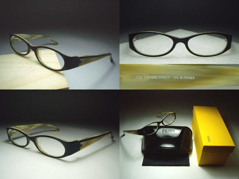 全新真品 FENDI 光學眼鏡, 公司貨, 義大利製, 黑色內石紋膠框, 鏡架有黑色 F 標誌.