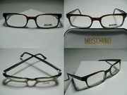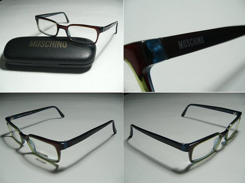 此付眼鏡, 義大利製, 紅寶石, 藍寶石, 和綠寶石三種顏色漸層地呈現在同一付鏡框上, 不同角度泛出不同的色澤, 非常迷人, 兩邊鏡架上頭有MOSCHINO標誌.
