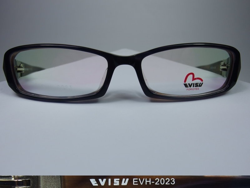 全新真品 EVISU 福神 眼鏡, 型號 EVH-2023, 時尚膠框, 轉軸處有金屬包覆, 金屬上有EVISU字樣的浮雕, 三角柱型鏡架, 時尚有型.