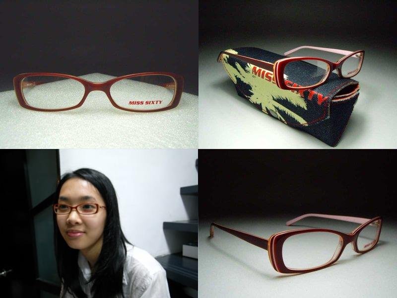 全新真品 MISS SIXTY 光學眼鏡, 暗赭紅色多層次膠框, 鏤刻字體鏡架, 鏡架有 MISS SIXTY 鏤刻字型, 漂亮有型.