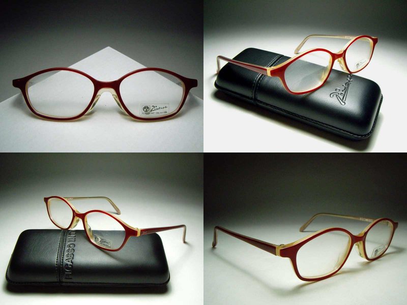 全新真品 PICASSO 畢卡索眼鏡, 雙色膠框, 紅色鏡架有 PICASSO LOGO, 時尚大方又迷人.