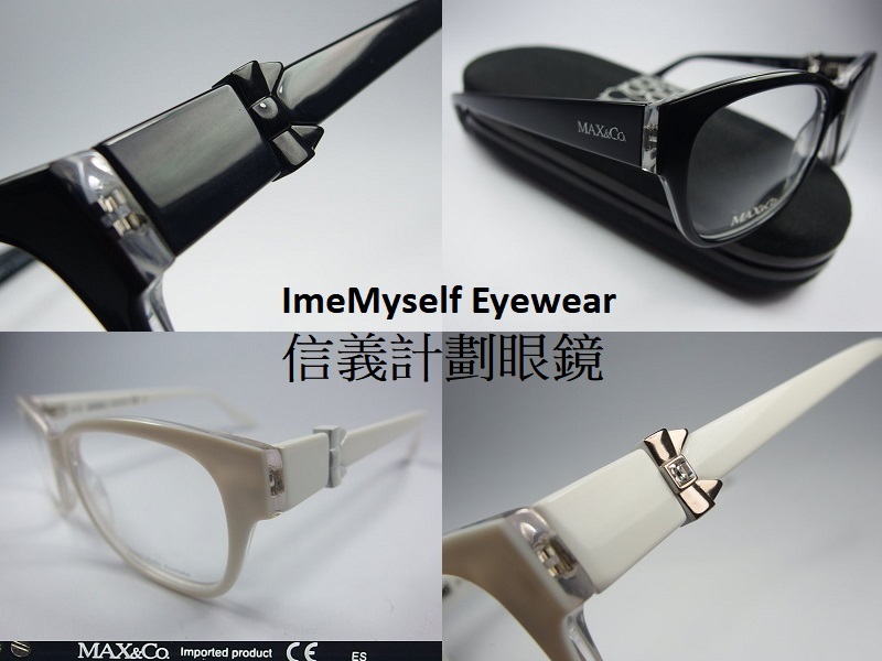 全新真品 Max&Co. 光學眼鏡, 165, 手工眼鏡 膠框 大框 彈簧鏡架, 右邊鏡腳上的蝴蝶結造型, 可轉換成素面或金屬水鑽面, 可愛迷人.