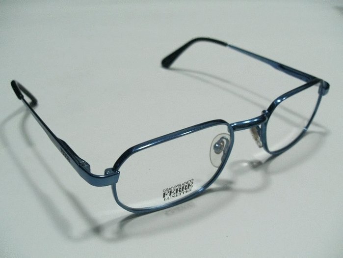 這件G FERRE 鏡架, 義大利製, 彈簧鏡架, 兩邊鏡架上面都有FERRE的LOGO. 藍色鏡架, 亮麗迷人.