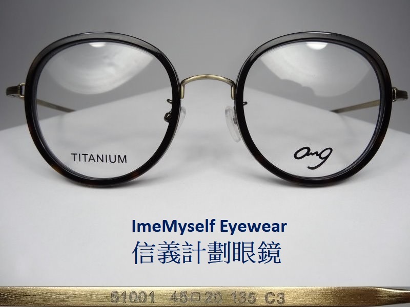 全新真品 OMG 光學眼鏡, 51001, 圓框 鈦金屬 膠框 有鼻墊 複合式材質, 復古有型.